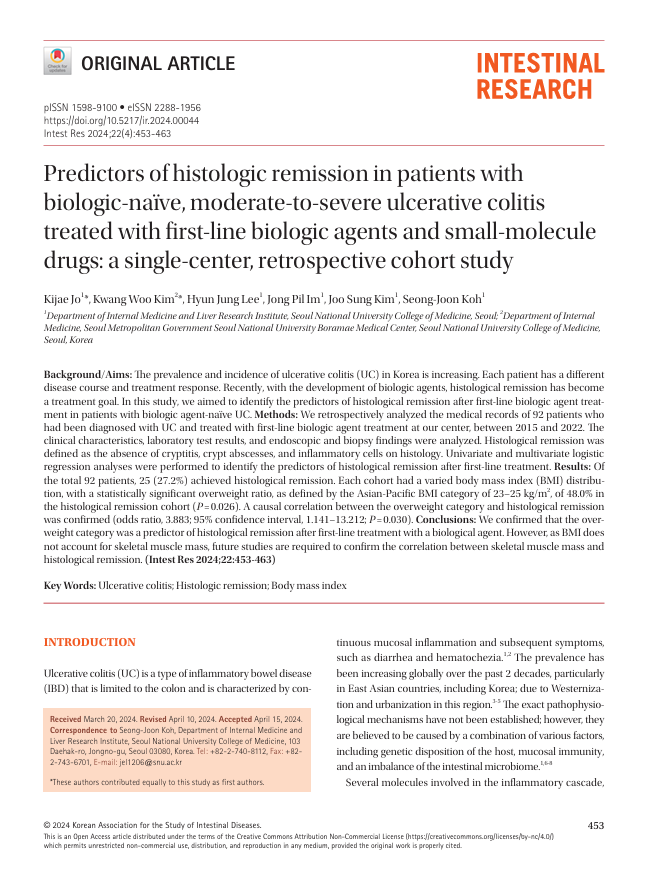 Results: Of the total 92 patients, 25 (27.2%) achieved histological remission. Each cohort had a varied body mass index (BMI) distribution, with a statistically significant overweight ratio, as defined by the Asian-Pacific BMI category of 23-25 kg/m2, of 48.0% in the histological remission cohort (P= 0.026). A causal correlation between the overweight category and histological remission was confirmed (odds ratio, 3.883; 95% confidence interval, 1.141-13.212; P= 0.030).