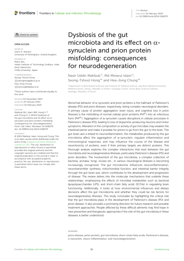 Title : Dysbiosis of the gut microbiota and its effect on α-synuclein and prion protein misfolding: consequences for neurodegeneration