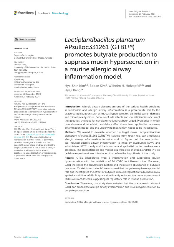 Title : Lactiplantibacillusplantarum APsulloc331261 (GTB1™) promotes butyrate production to suppress mucin hypersecretion in a murine allergic airway inflammation model
