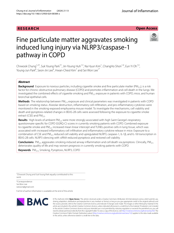 Results: High levels of ambient PM2.5 were more strongly associated with high Saint George's respiratory questionnaire specific for COPD (SGRQ-C) scores in currently smoking patients with COPD. Combined exposure to cigarette smoke and PM2.5 increased mean linear intercept and TUNEL-positive cells in lung tissue, which was associated with increased inflammatory cell infiltration and inflammatory cytokine release in mice. Exposure to a combination of CSE and PM2.5 reduced cell viability and upregulated NLRP3, caspase-1, IL-1β, and IL-18 transcription in BEAS-2B cells. NLRP3 silencing with siRNA reduced pyroptosis and restored cell viability.