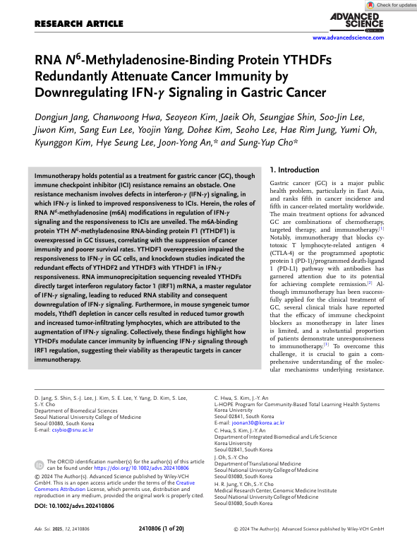Title : RNA N6-Methyladenosine-Binding Protein YTHDFs Redundantly Attenuate Cancer Immunity by Downregulating IFN-γ Signaling in Gastric Cancer