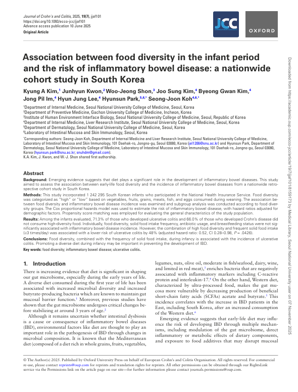 Title : Association between food diversity in the infant period and the risk of inflammatory bowel disease: a nationwide cohort study in South Korea