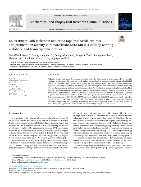 Title : Co-treatment with melatonin and ortho-topolin riboside exhibits anti-proliferation activity in radioresistant MDA-MB-231 cells by altering metabolic and transcriptomic profiles