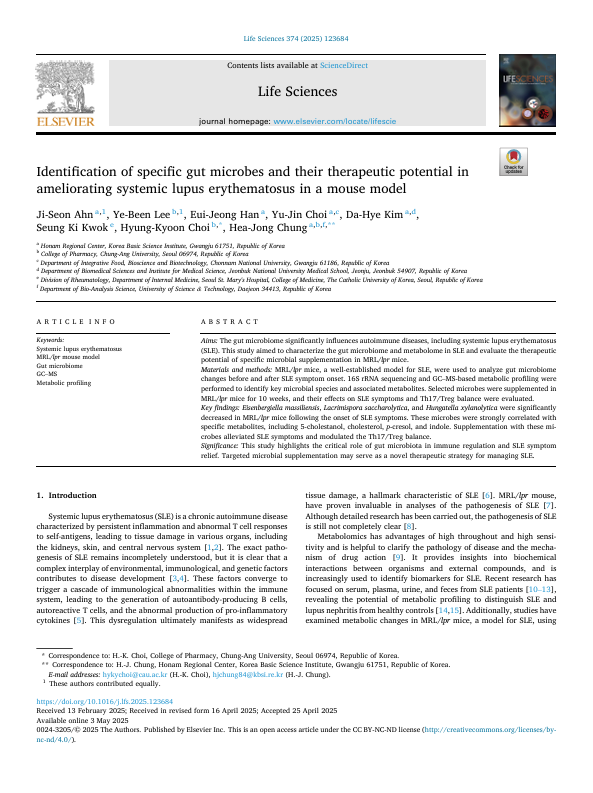 Key findings: Eisenbergiella massiliensis, Lacrimispora saccharolytica, and Hungatella xylanolytica were significantly decreased in MRL/lpr mice following the onset of SLE symptoms. These microbes were strongly correlated with specific metabolites, including 5-cholestanol, cholesterol, p-cresol, and indole. Supplementation with these microbes alleviated SLE symptoms and modulated the Th17/Treg balance.