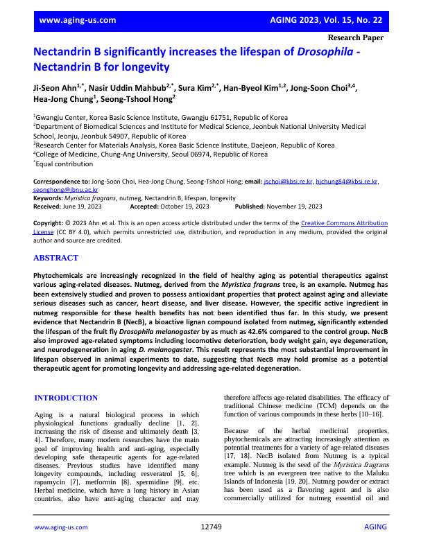 Title : Nectandrin B significantly increases the lifespan of Drosophila - Nectandrin B for longevity