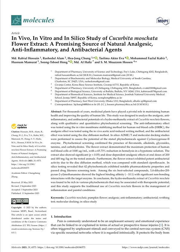 Title : In Vivo, In Vitro and In Silico Study of Cucurbita moschata Flower Extract: A Promising Source of Natural Analgesic, Anti-Inflammatory, and Antibacterial Agents