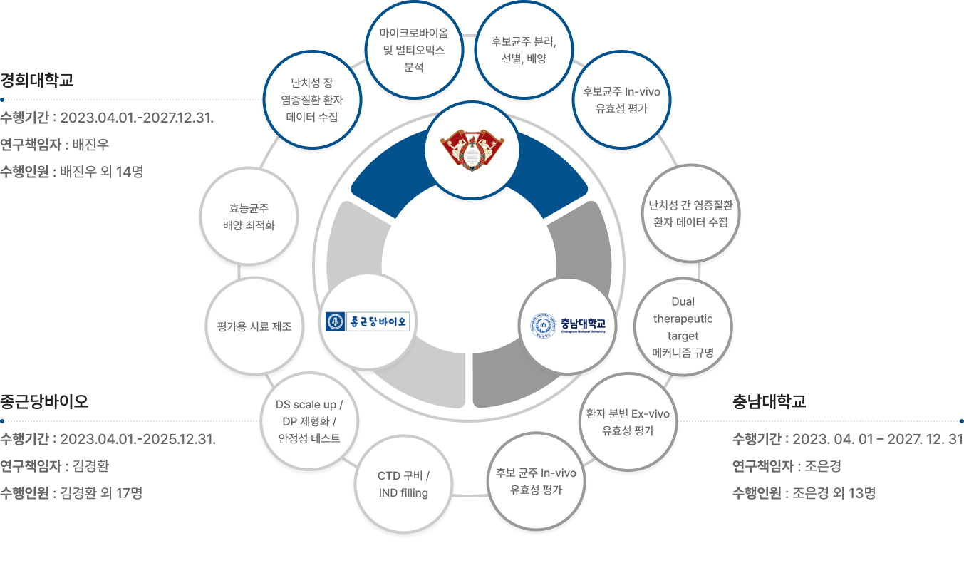 | 4차년도 | 제제화된 효능균주의 In-vivo 유효성 평가 및 장-간 축 조절 기전의 검증, 비임상 독성 연구를 통한 안전성 확인 및 CTD 구비 |
