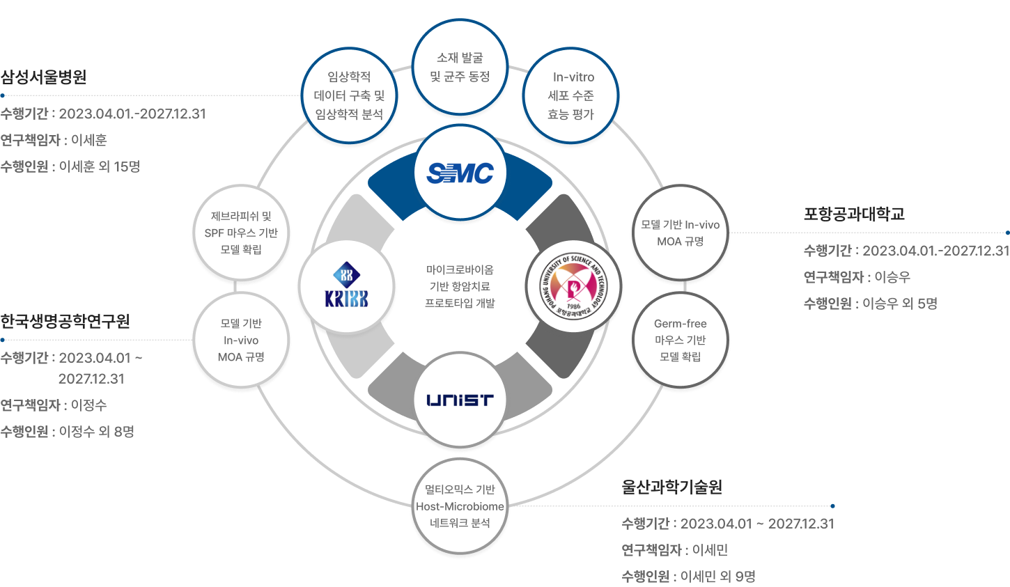 | 단계별 목표 | 마이크로바이옴 기반 항암치료 소재 발굴 및 작용 기전 규명 |