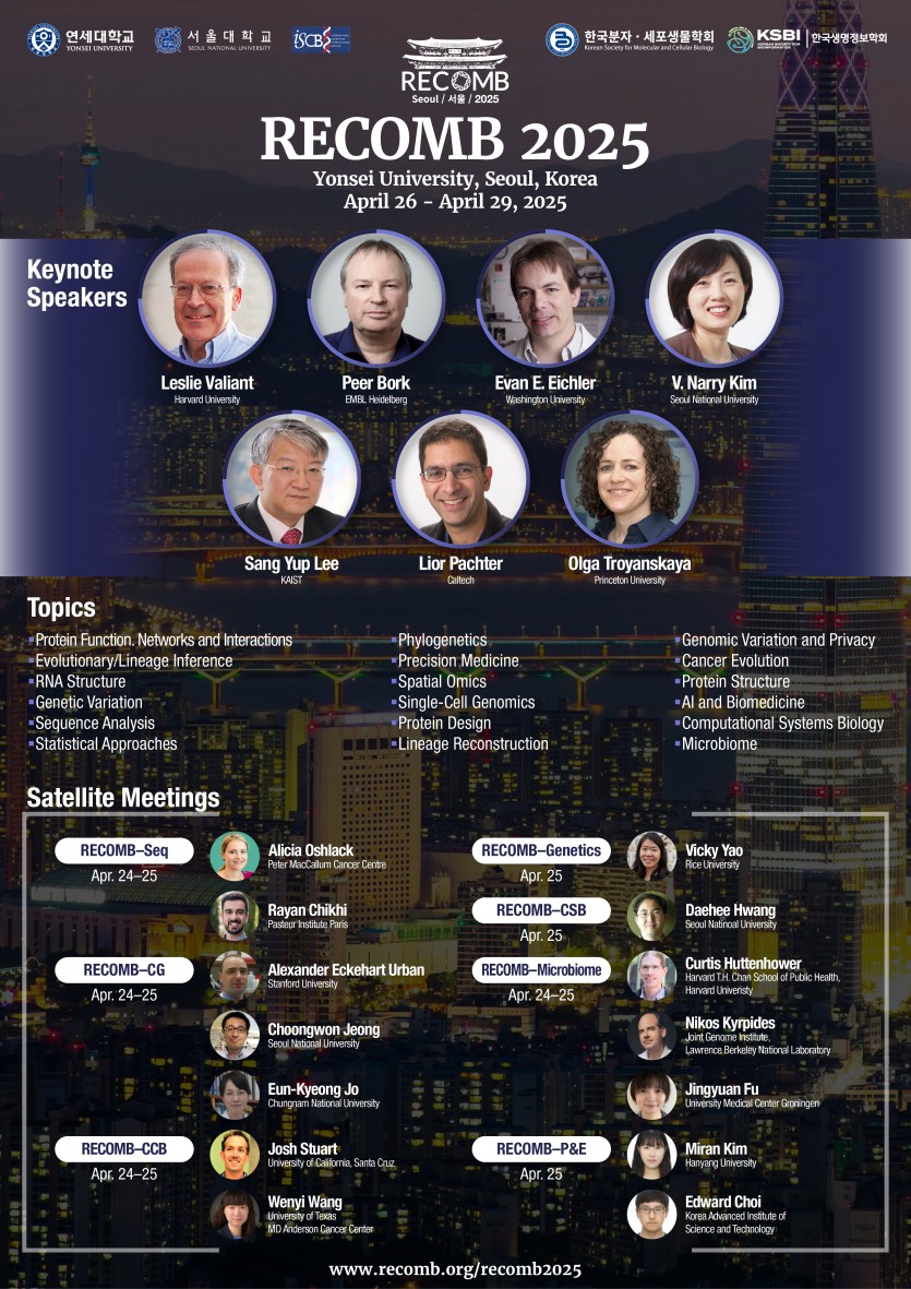 2025년 04월 26일부터 4월 29일까지 연세대학교 신촌캠퍼스에서 RECOMB 2025가 개최될 예정입니다. 관심있는 분들은 많은 참여 부탁드립니다.