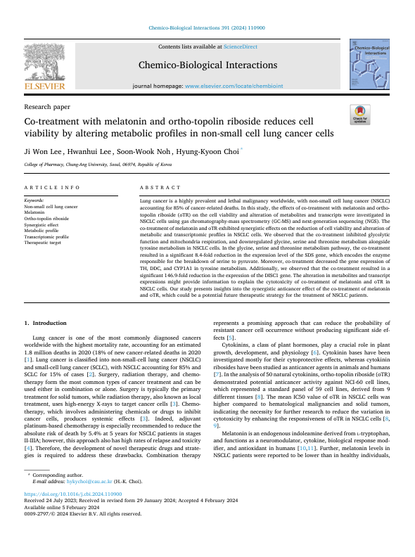 Title : Co-treatment with melatonin and ortho-topolin riboside reduces cell viability by altering metabolic profiles in non-small cell lung cancer cells