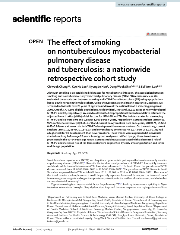 Title : The effect of smoking on nontuberculous mycobacterial pulmonary disease and tuberculosis: a nationwide retrospective cohort study