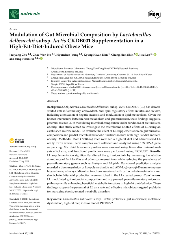 Title : Modulation of Gut Microbial Composition by Lactobacillus delbrueckii subsp. lactis CKDB001 Supplementation in a High-Fat-Diet-Induced Obese Mice