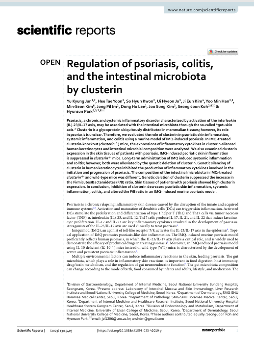 Title : Regulation of psoriasis, colitis, and the intestinal microbiota by clusterin