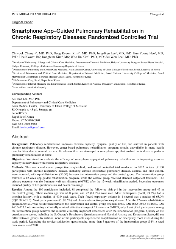 [생균제(이세원연구팀)-2025] Smartphone App-Guided Pulmonary Rehabilitation in Chronic Respiratory Diseases: Randomized Controlled Trial