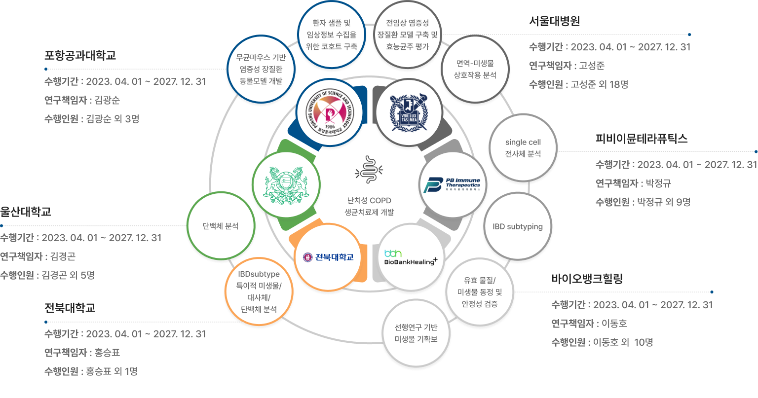 | 3차년도 | 분변이식 및 인체유래물 분석, 코호트 오믹스 분석 및 전임상 연구를 통한 유용미생물 확인, 유용미생물 분리/동정을 통한 균주 배양 생산법 확보, 단일세포 전사체 데이터를 활용한 효능 균주의 타겟 세포 분석 |